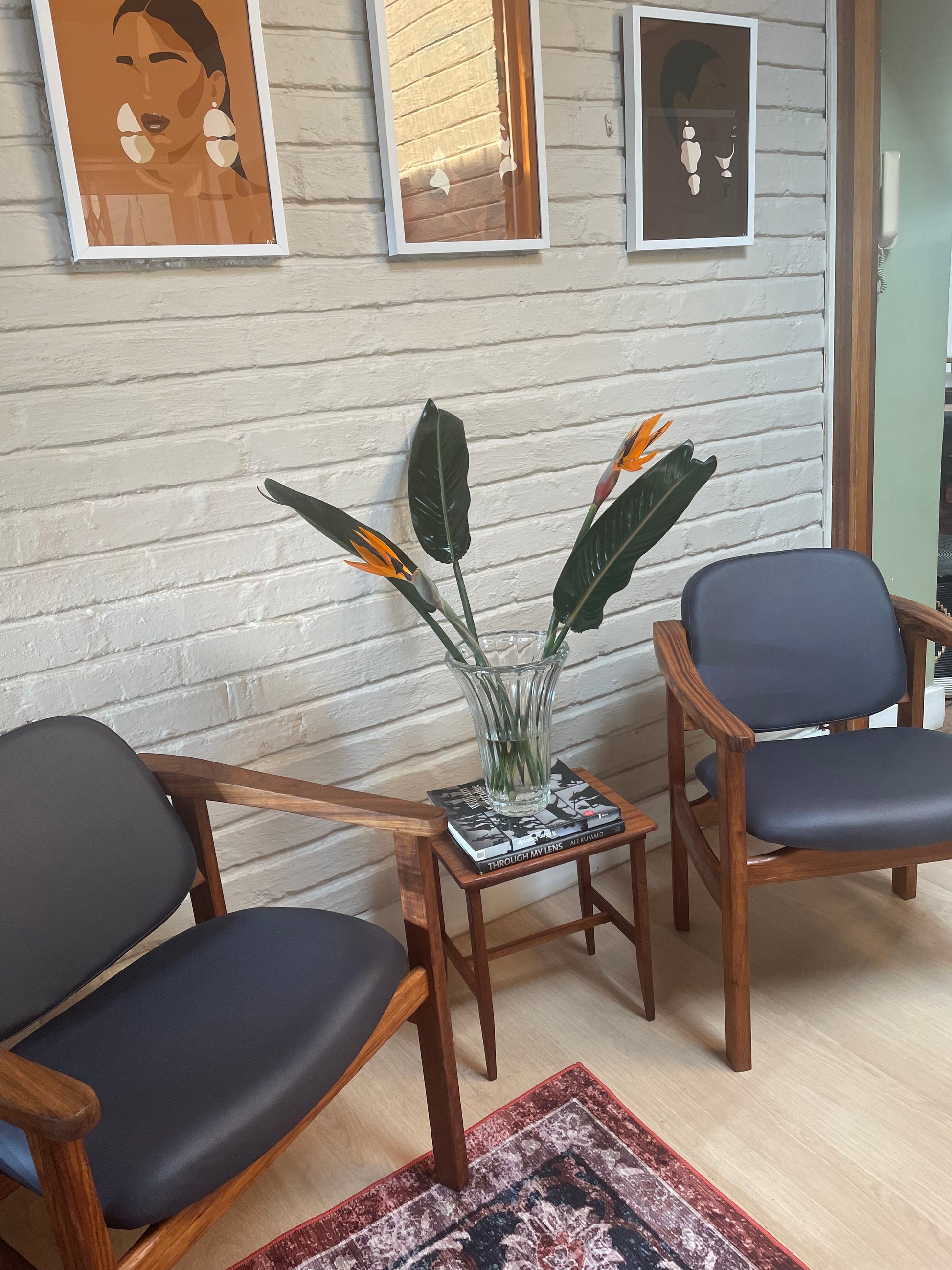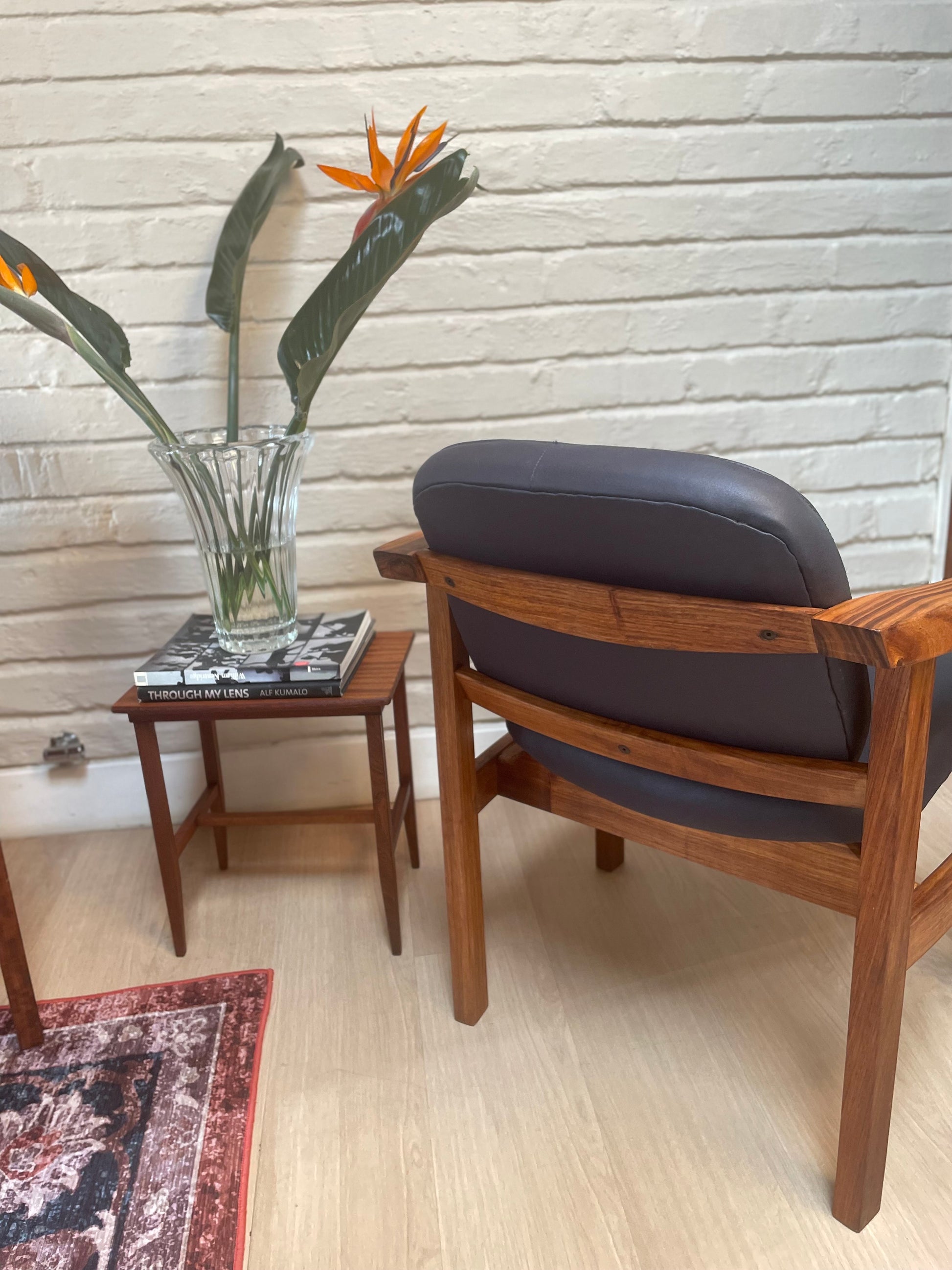 A timeless pair of Kallenbach armchairs, lovingly restored by 31st Home. Crafted from solid Kiaat, their sculptural frames speak to mid-century elegance and African heritage. Reupholstered in deep navy vinyl, they offer a bold, modern contrast while preserving the warmth of the original wood grain. Each piece is a quiet celebration of legacy—refined, resilient, and ready to anchor a soulful space.