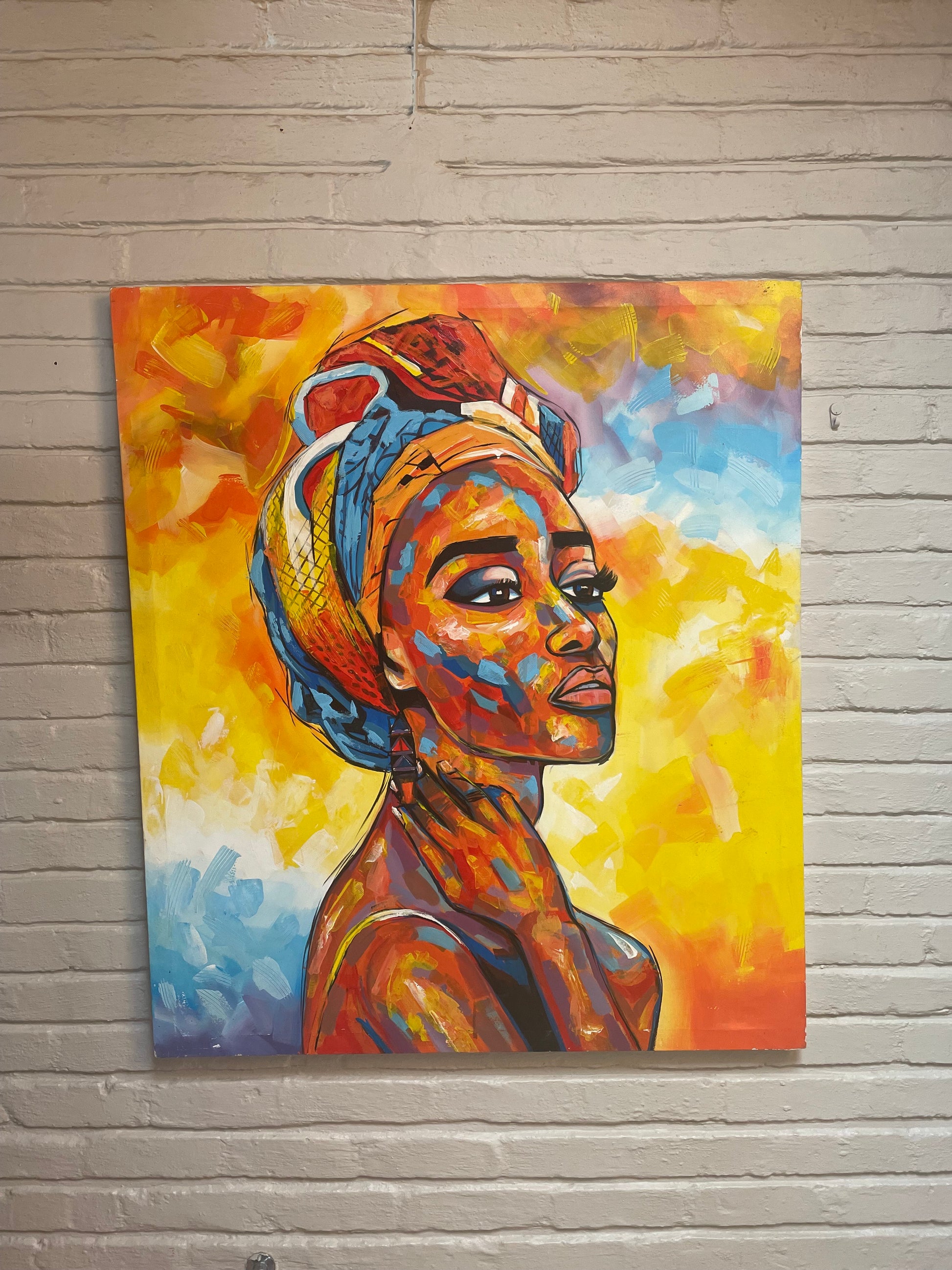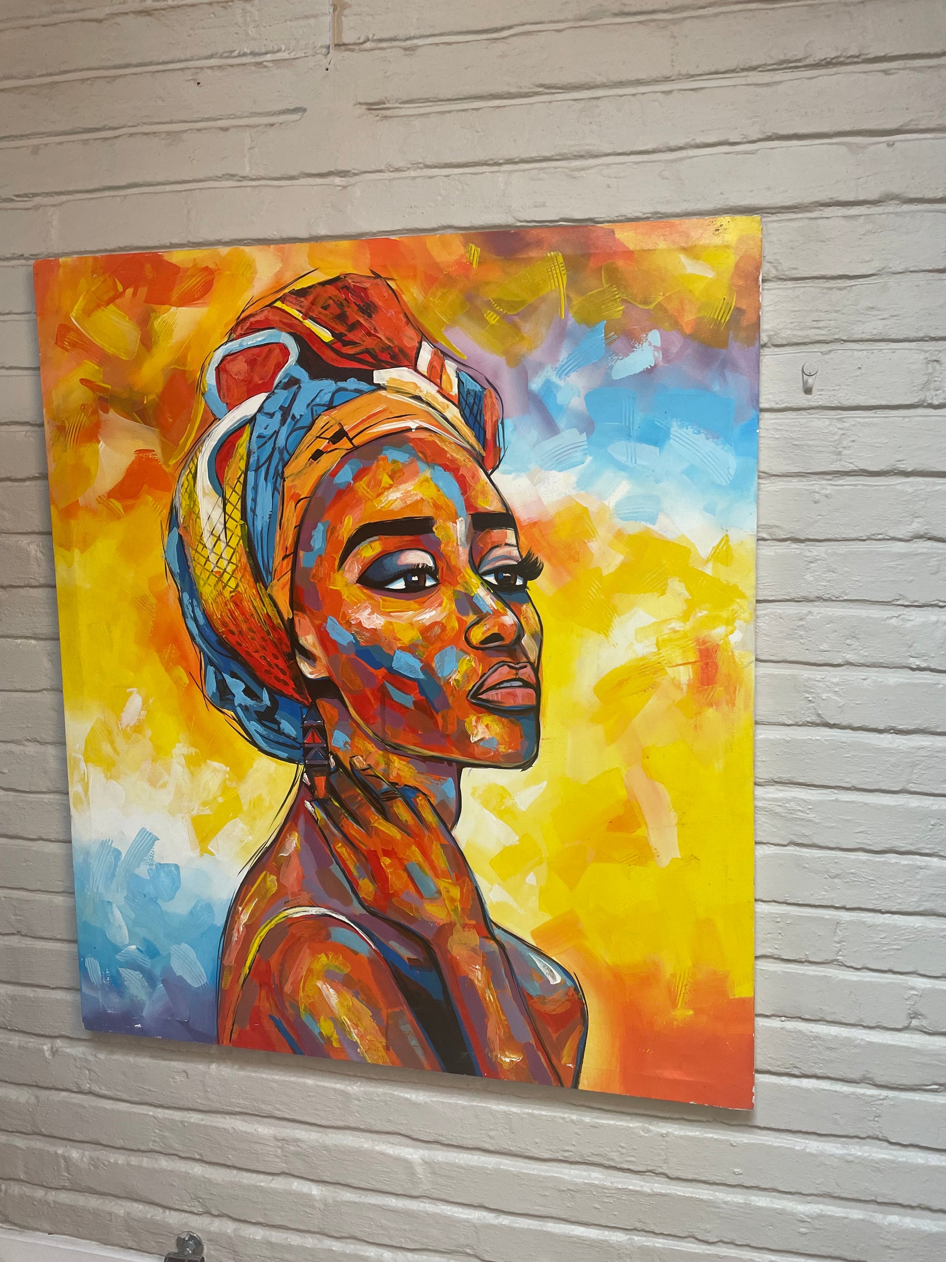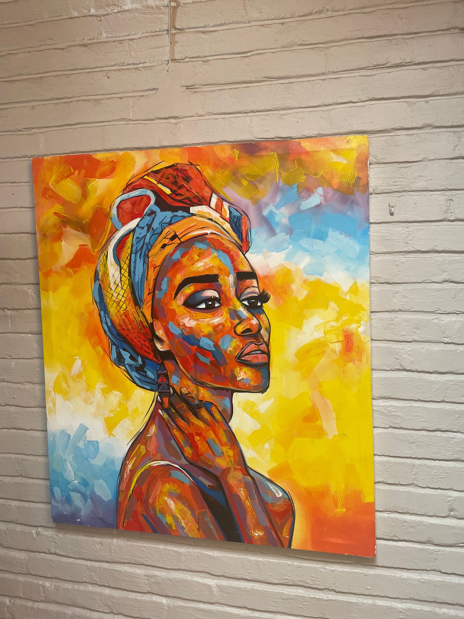This acrylic painting, titled “Gomolemo,” captures the essence of youthful optimism and serene beauty, a name that fittingly means “the joyful one” or “the one who brings happiness.” Bold splashes of sunset colors—vibrant orange, soft pink, and serene sky blue—form the backdrop to mirror the subject’s calm and composed demeanor.