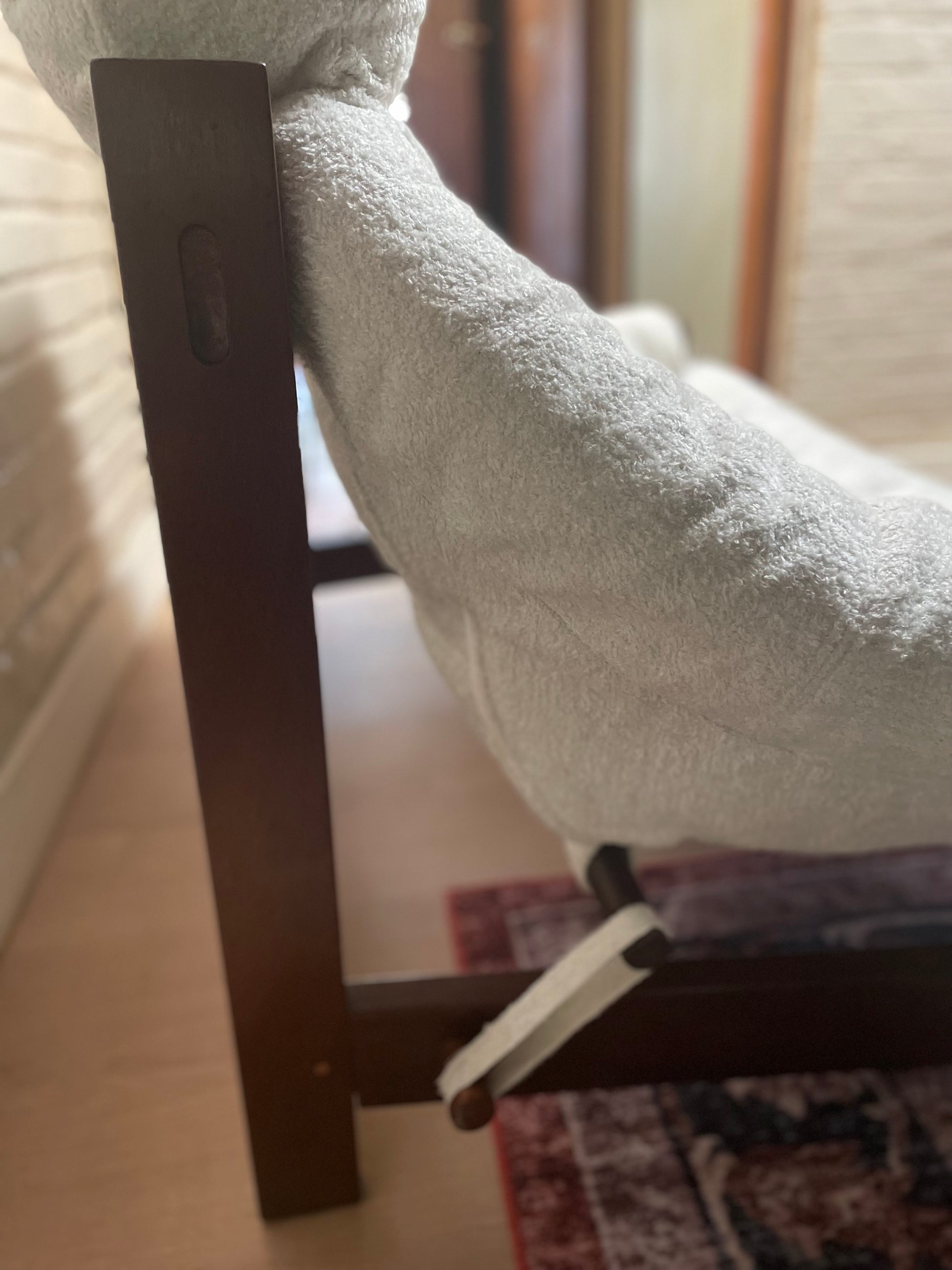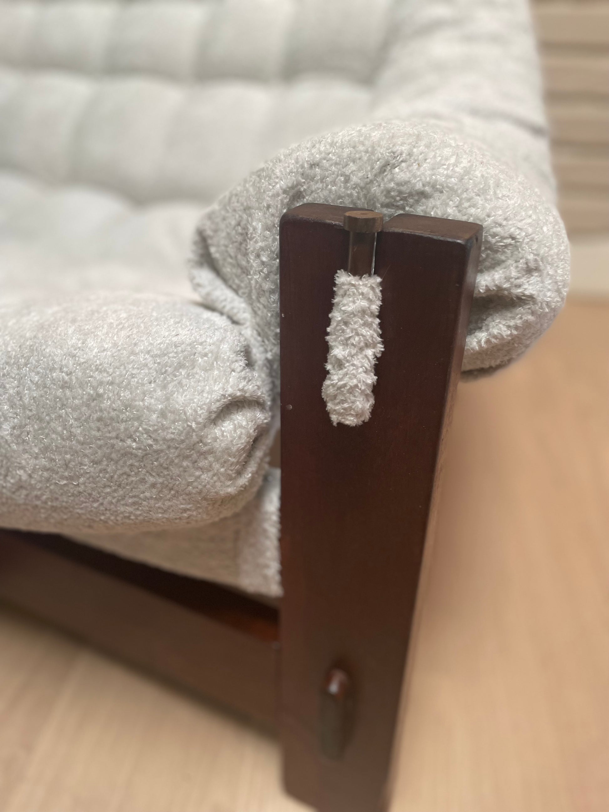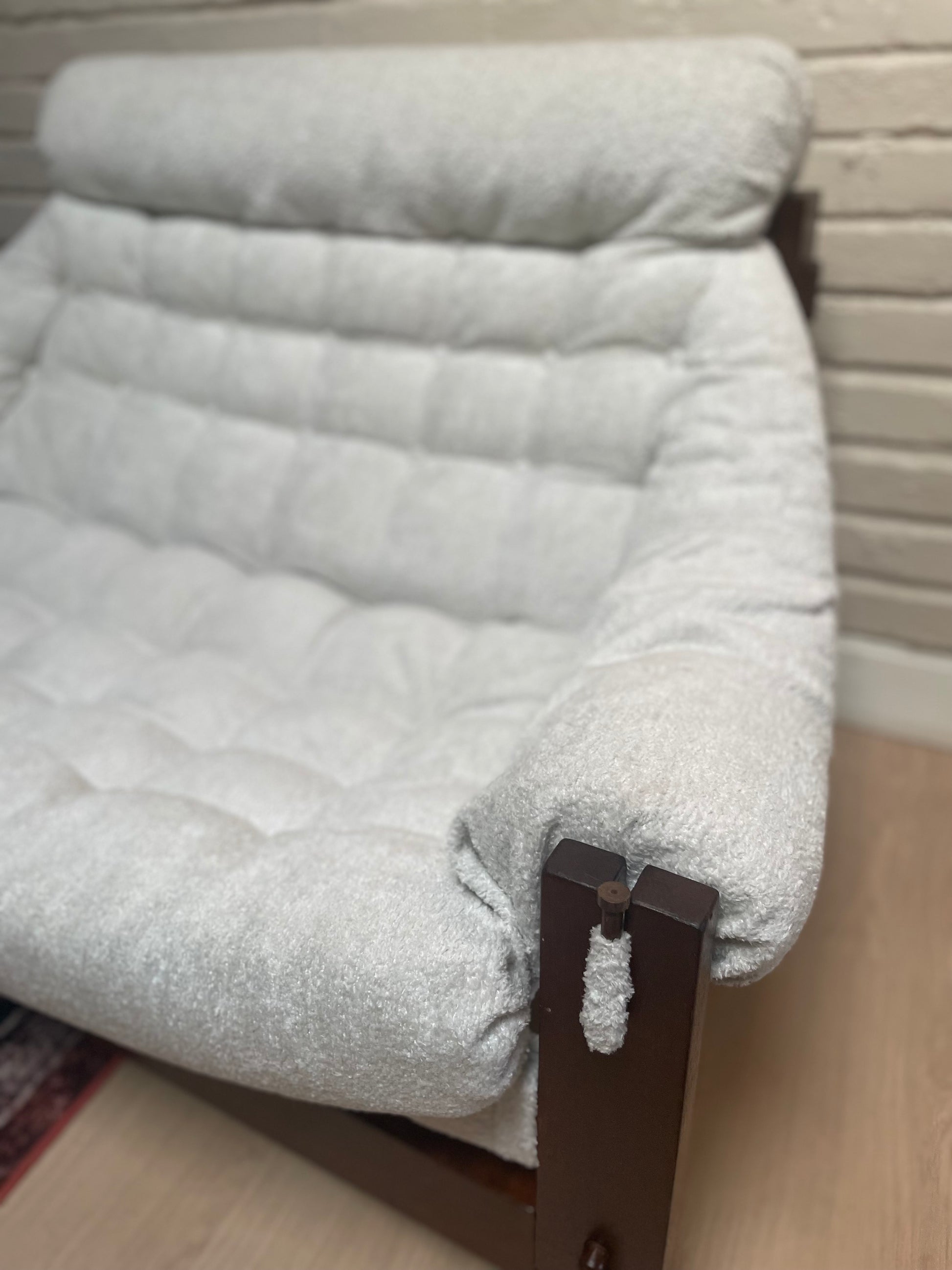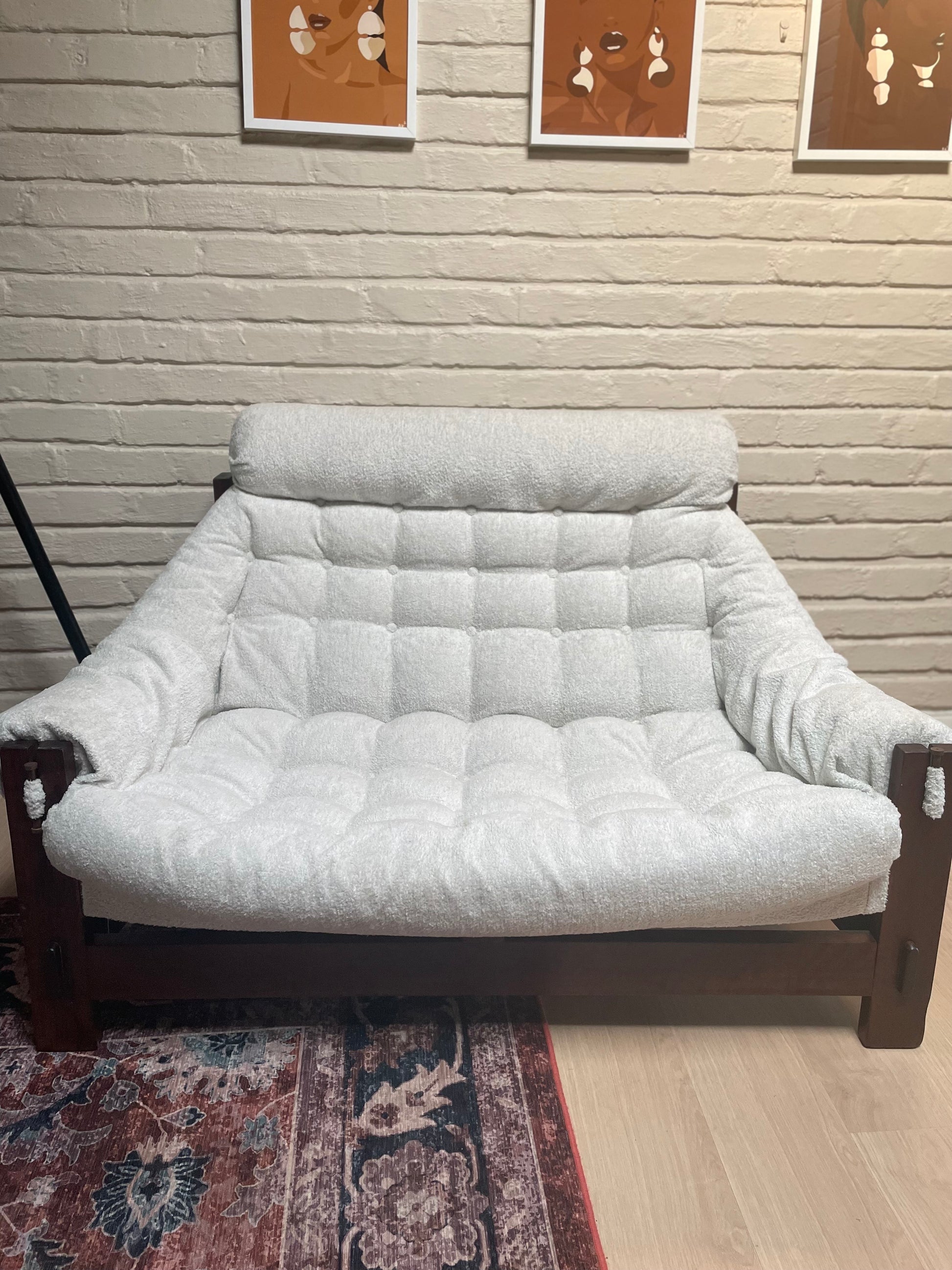 This 1970s-era two-seater sling lounger pairs sculptural elegance with laid-back comfort, crafted from solid Imbuia—a richly grained hardwood prized for its durability and warm tone. The frame’s interlocking peg joinery evokes Brazilian modernist influences, while the canvas sling and tufted cushions in off-white sherpa offer a hammock-like embrace that invites pause, presence, and partnership.