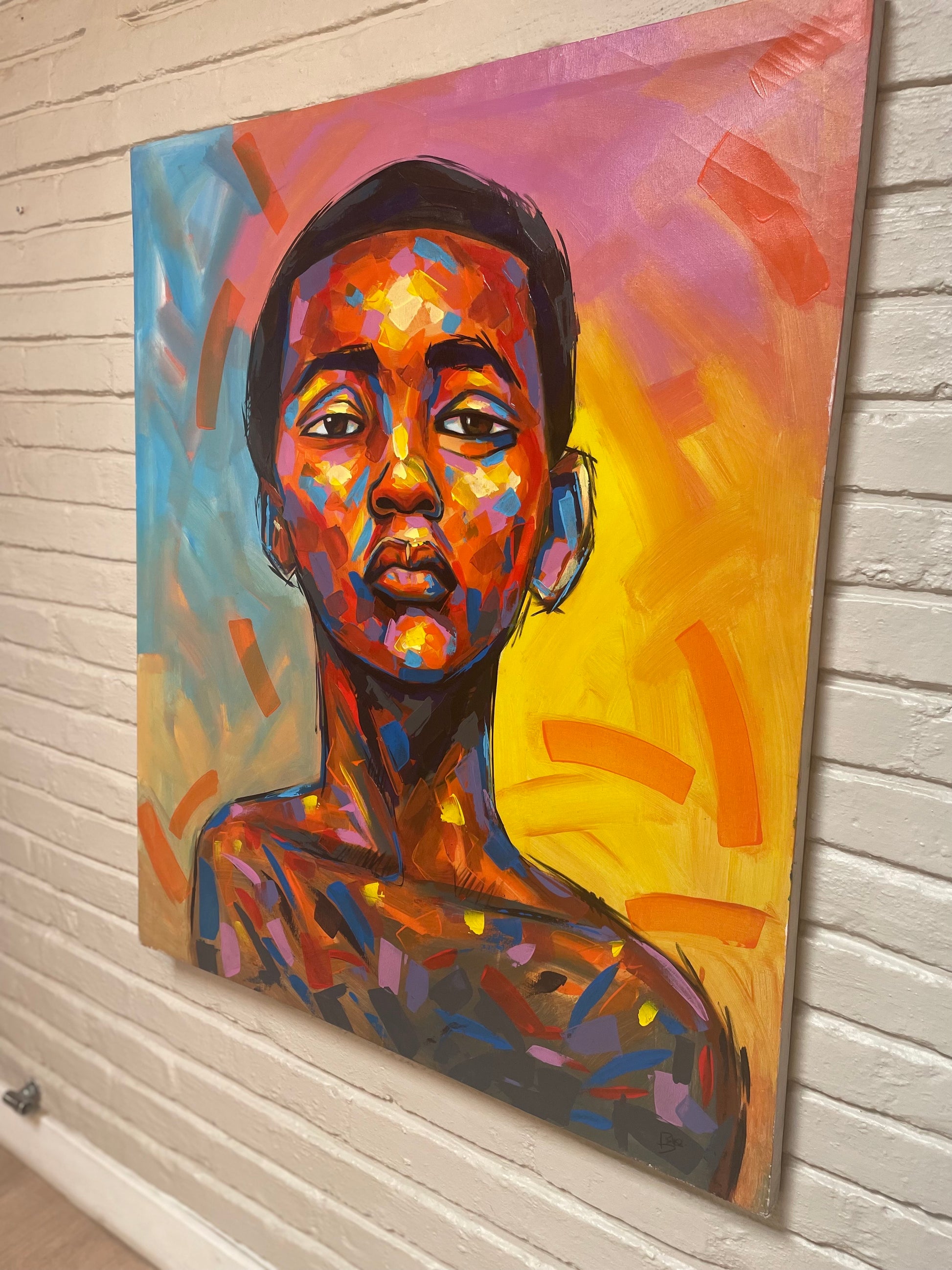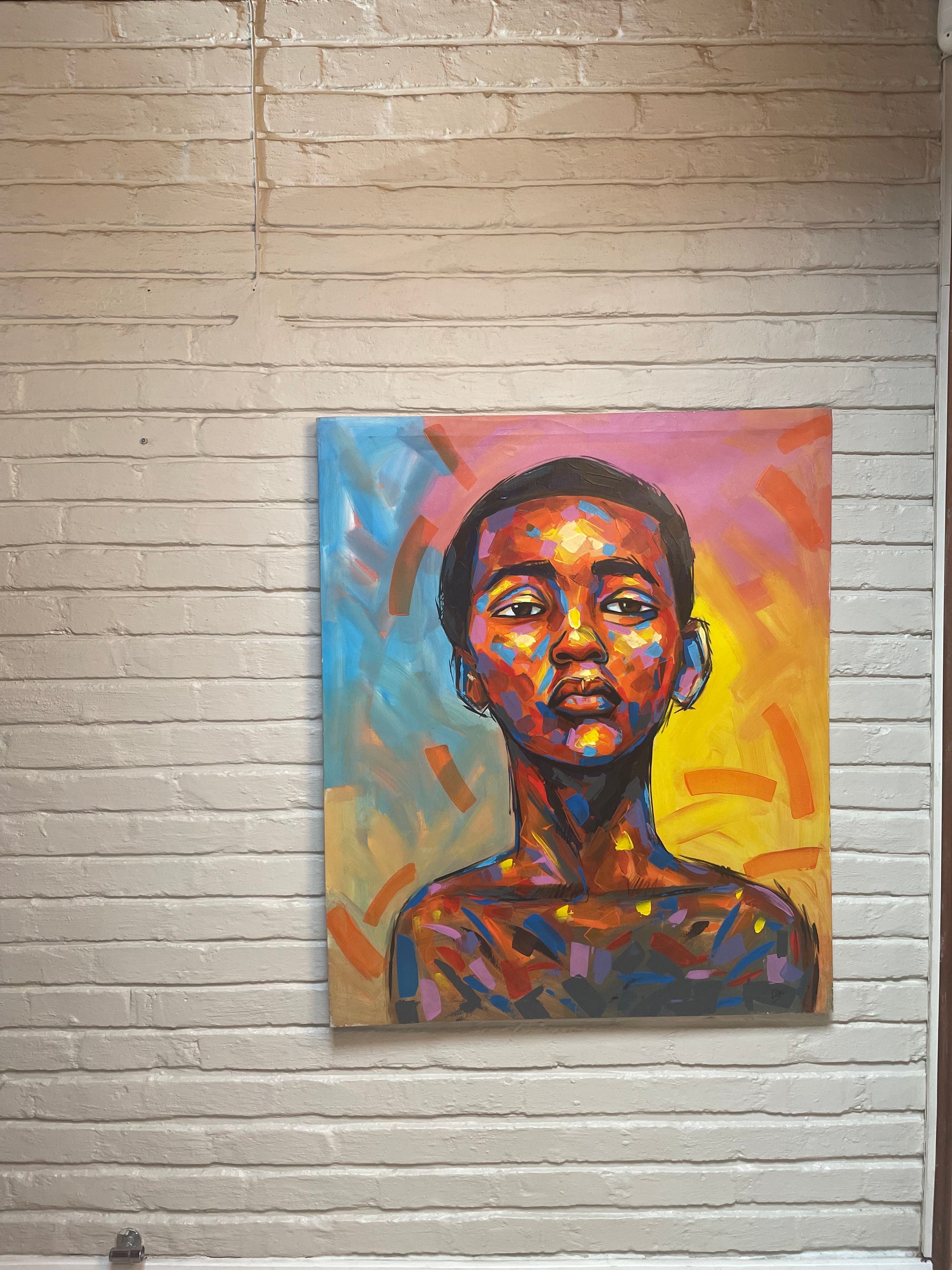“Mahlohonolo”—a name that means “blessings” or “good fortune”—is an acrylic painting that explores the profound contrast between expectation and reality. The artwork, with its vibrant shades of pink, yellow, and light blue, suggests a world of youthful optimism, a fleeting season of beauty and light.