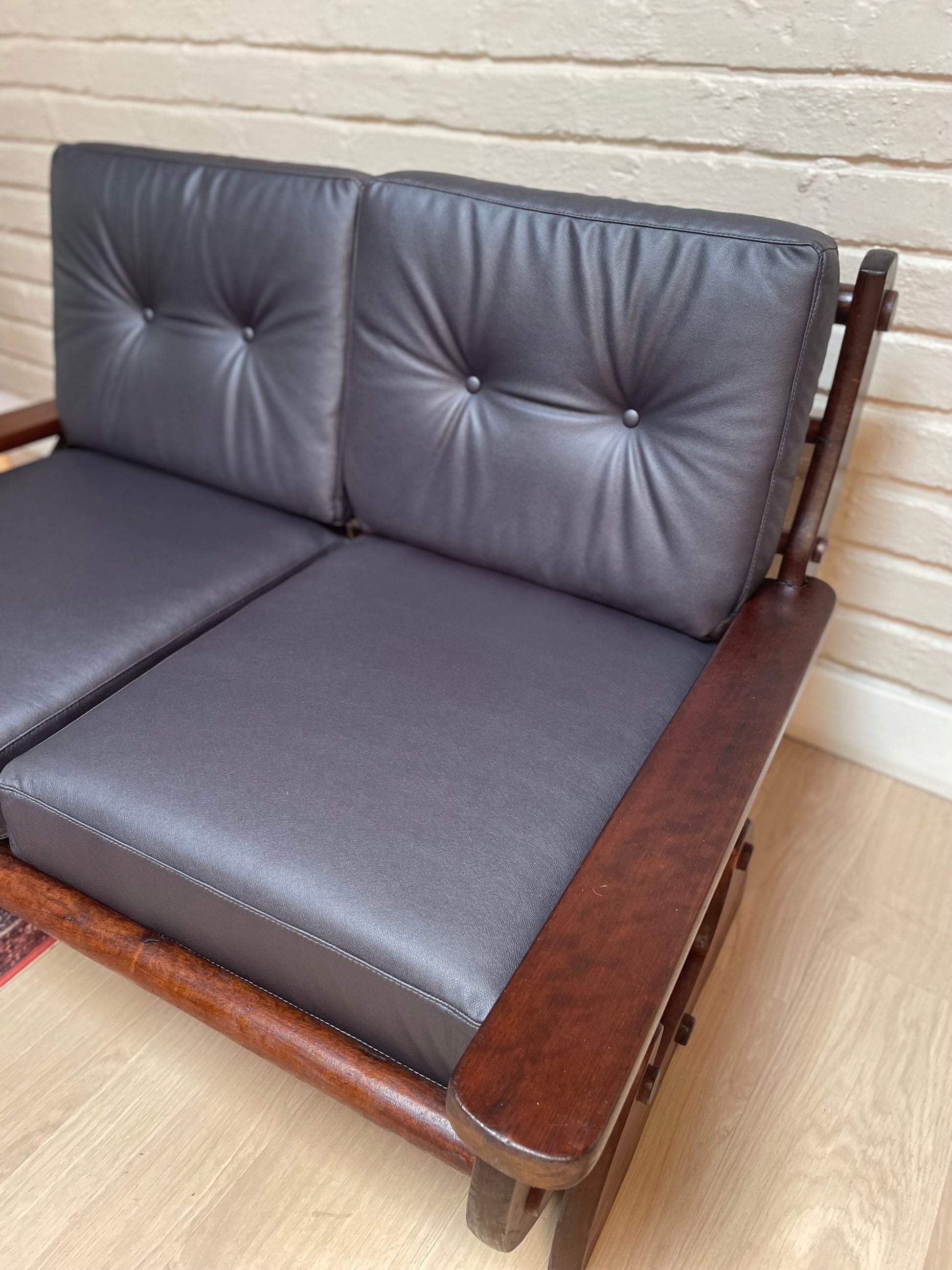 Handcrafted from richly toned South African Imbuia, this restored mid-century two-seater is a sculptural ode to enduring craftsmanship. Its original joinery and soulful character have been lovingly preserved, then elevated with low-VOC finishes that honor both heritage and sustainability. The reimagined vinyl upholstery—featuring a dual-button backrest—introduces a note of modern practicality, while reversible seat cushions offer effortless maintenance and adaptable style.