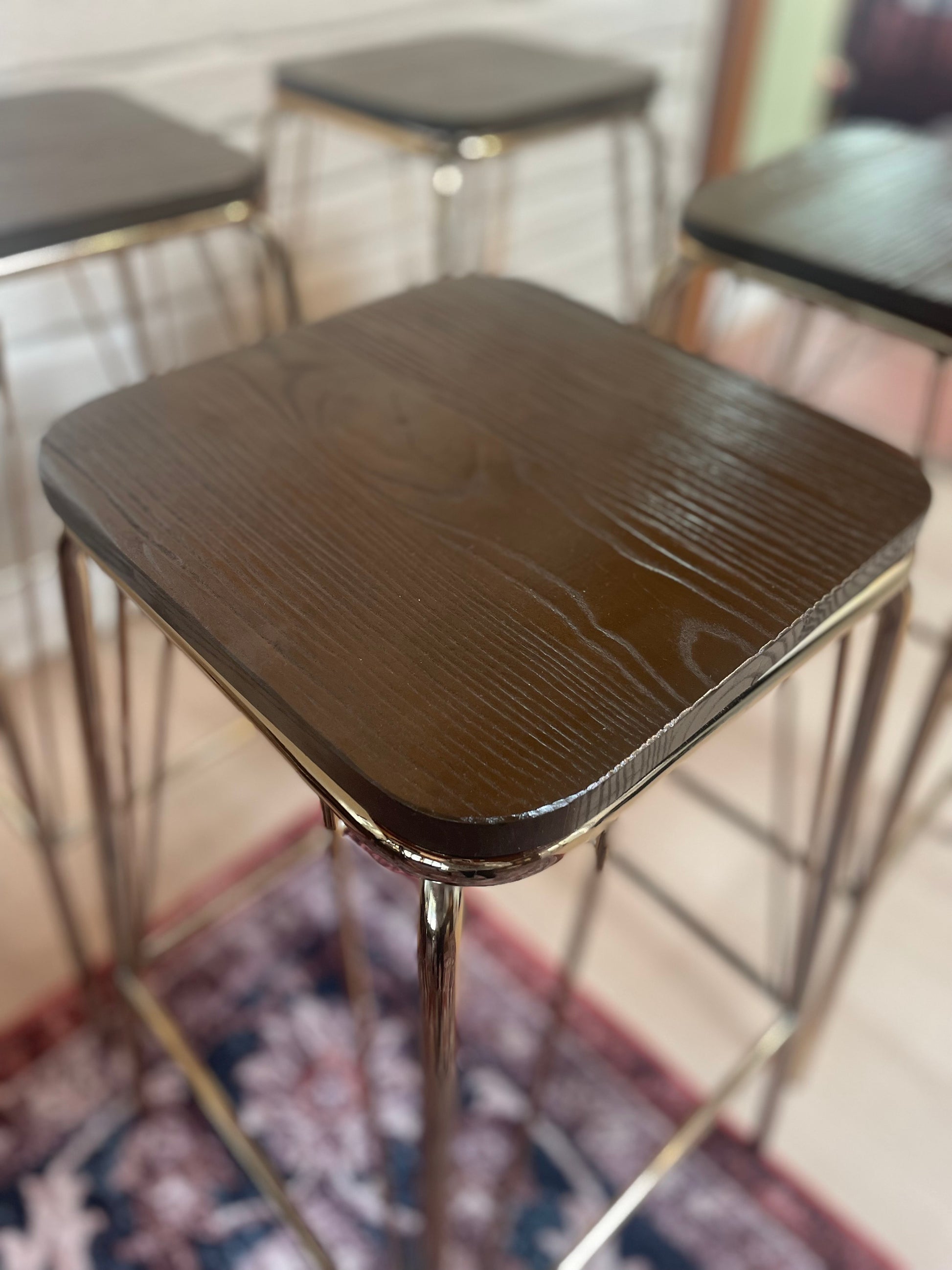A nostalgic nod wrapped in modern elegance. This bar stool features a gold-coated aluminum frame with gentle curves and tapered legs inspired by 1950s café seating. The seat is crafted from oak, stained in a deep brown finish that evokes vintage warmth and timeless sophistication.